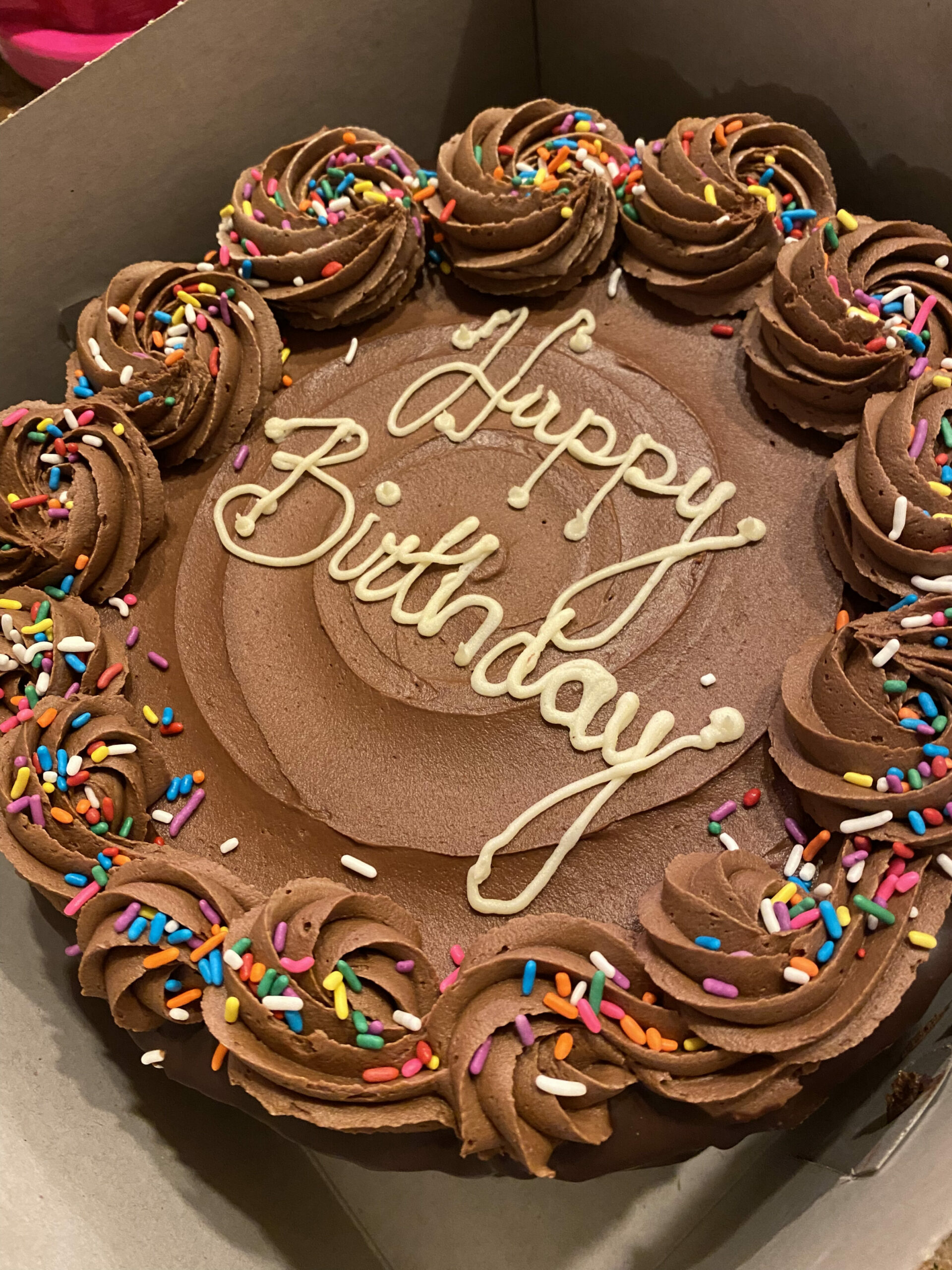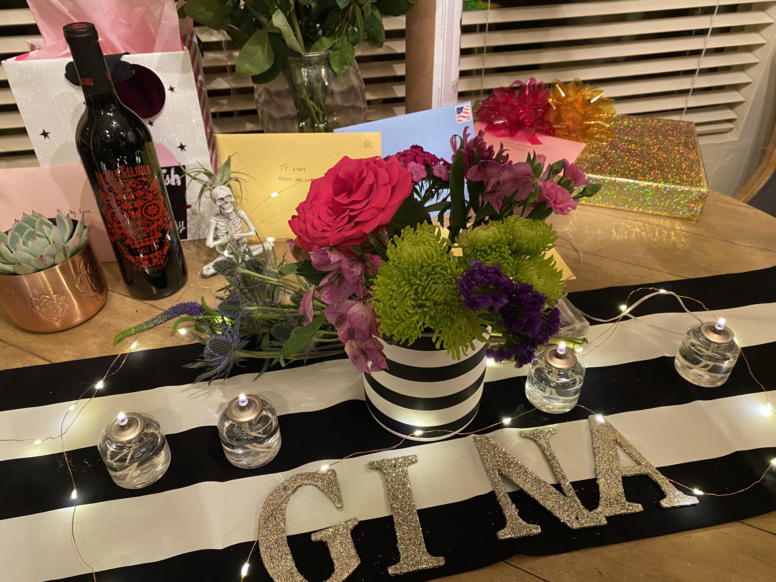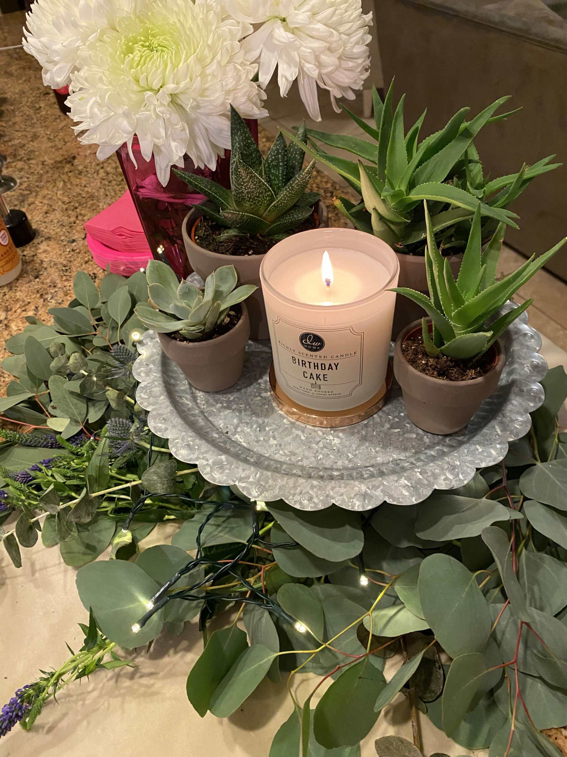 The cutest decorations my stepmom brought over last week. We were planning on going out for a bday dinner, but P had the sniffles and stayed home from school, so I texted everyone to say we were going to raincheck. I ended up having kind of a bummer day – I was just in a funk and going through some things – and the family ended up coming over here for dinner and cake. A bad morning/day turned into a lovely evening.