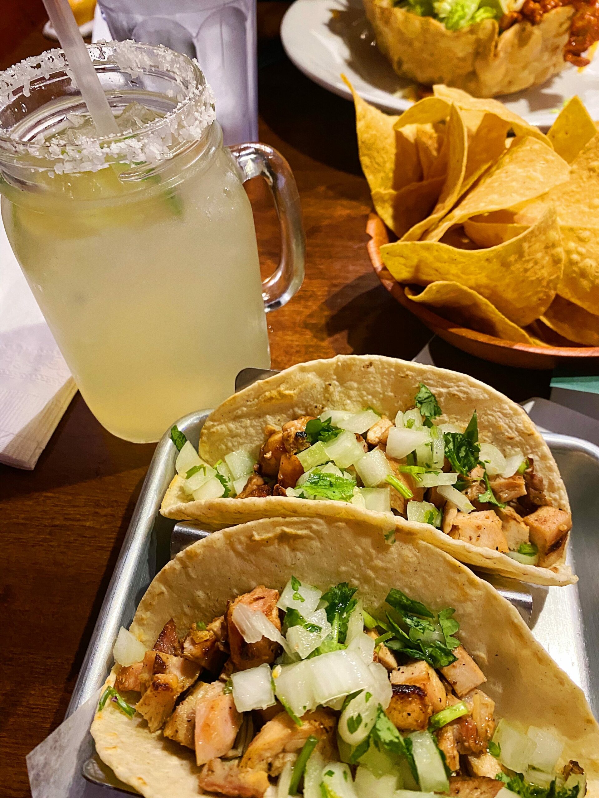 Dinner: Taco Tuesday! Two chicken tacos, 1 margarita, and approximately 1483 chips at Calle Tepa