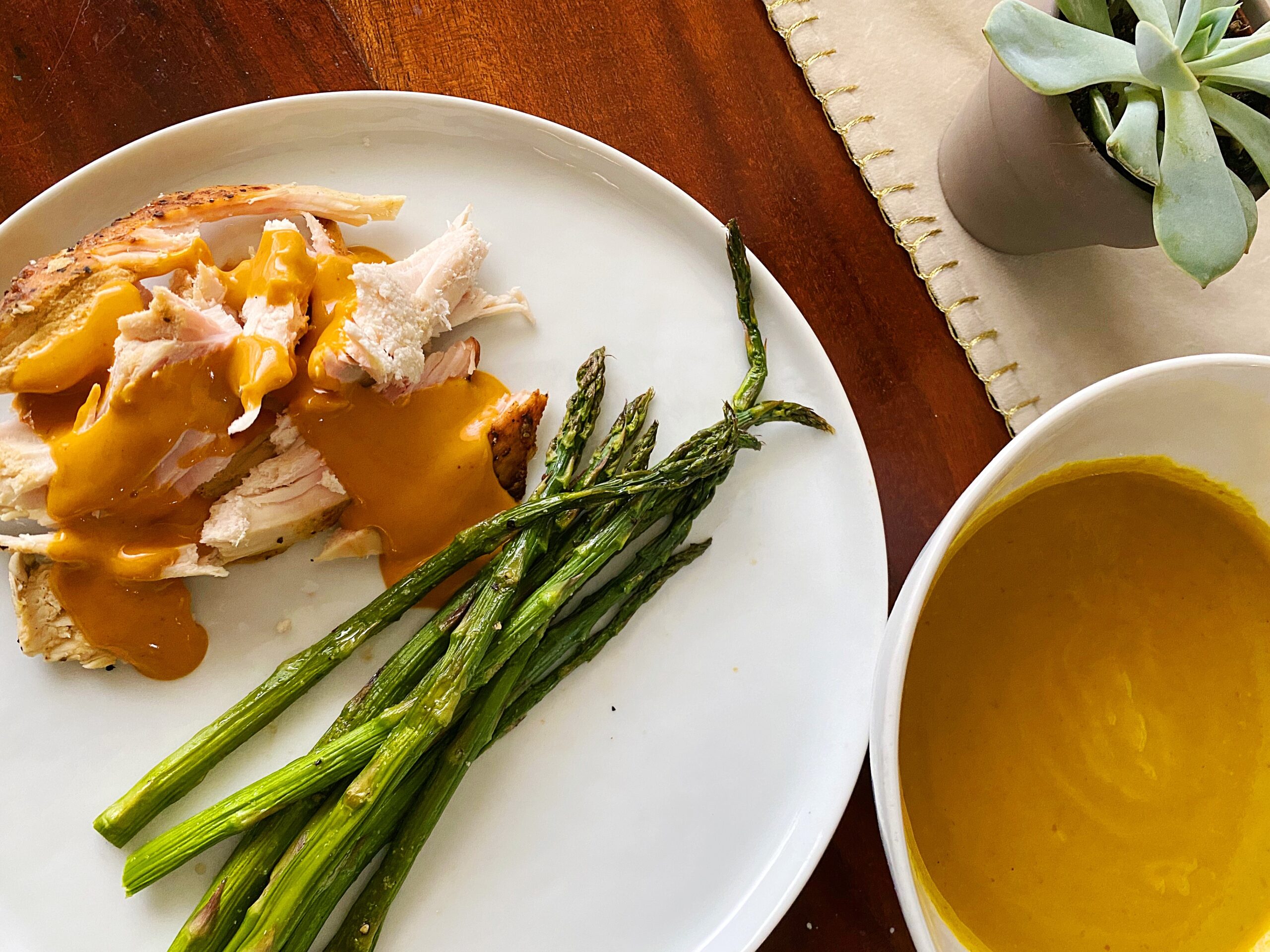 It was a little lower on the veggie side. I got three-ish servings of veggies (spinach, asparagus, and pumpkin soup), and my goal is typically 4-6 fists of non-starchy veggies.Ā